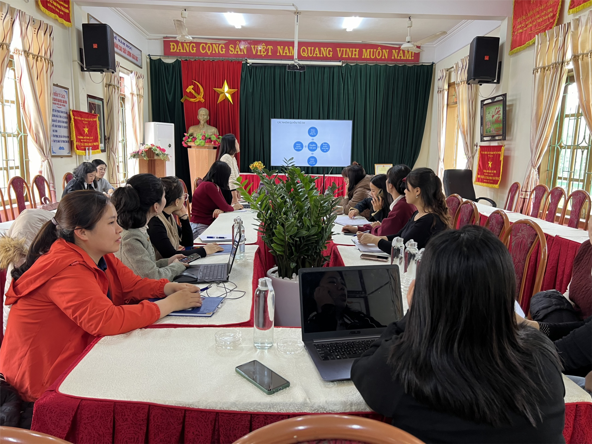 Chiều ngày 23/01/2025, Trường MN Sao Sáng tổ chức bồi dưỡng chuyên môn về "Quyền con người" cho giáo viên. Đồng chí phó hiệu trưởng đã hướng dẫn giáo viên lập kế hoạch giáo dục xen kẽ "Quyền con người" để dạy trẻ trong các hoạt động sinh hoạt trong ngày của trẻ tại trường mầm non.