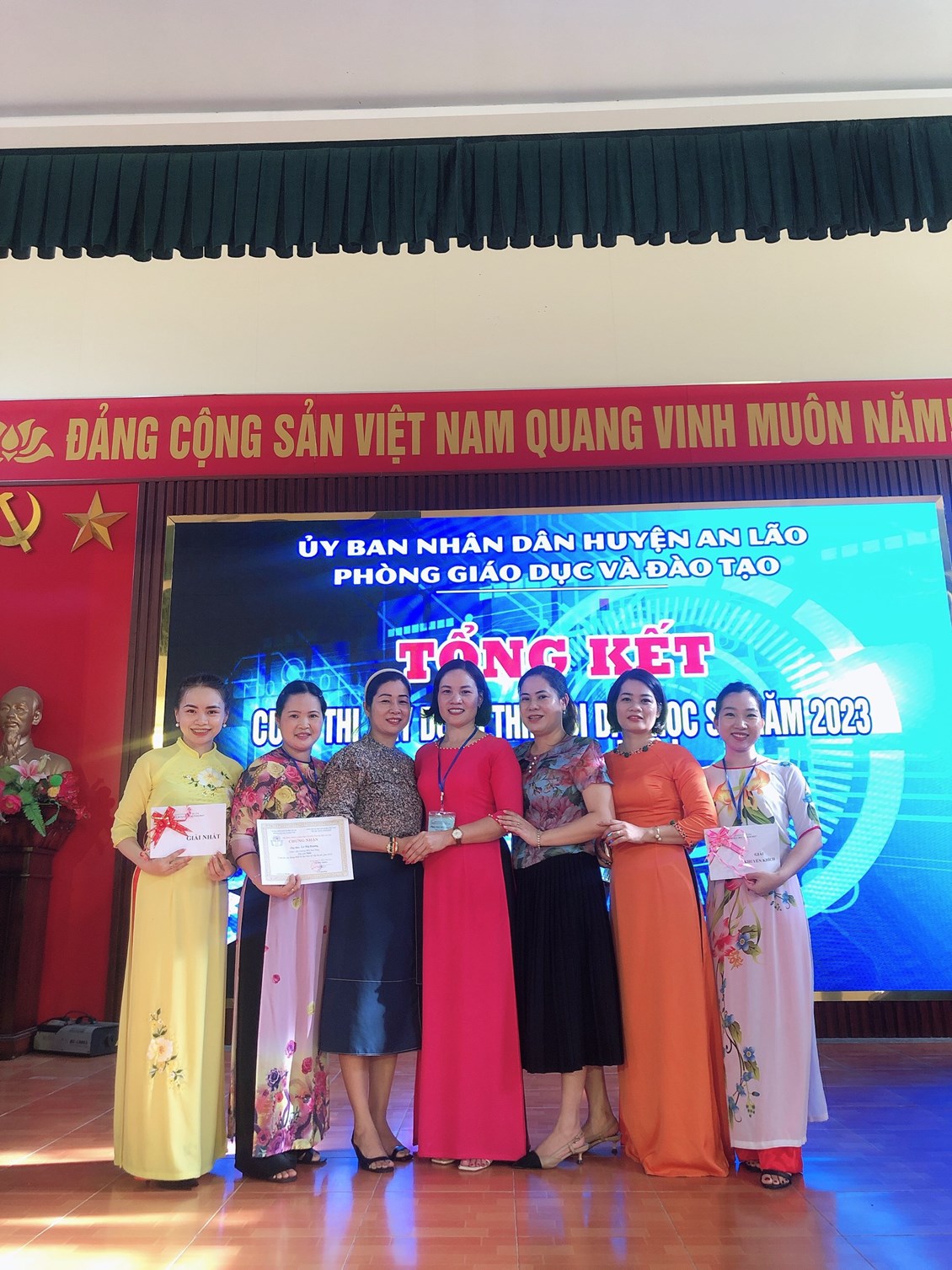 Ngày 2/8/2023 các đoàn viên xuất sắc đại diện cho trường tham dự hội thi thiết kế thiết bị dạy học số với 2 sản phẩm dự thi: Bộ trò chơi và bài tập tương tác dành cho trẻ mẫu giáo 3- 4 tuổi và bộ trò chơi giúp trẻ làm quen và ôn luyện chữ cái cho bé 5-6 tuổi. Với sự cố gắng nỗ lực 2 sản phẩm đã xuất sắc đạt 1 giải nhất và 1 giải khuyến khích.