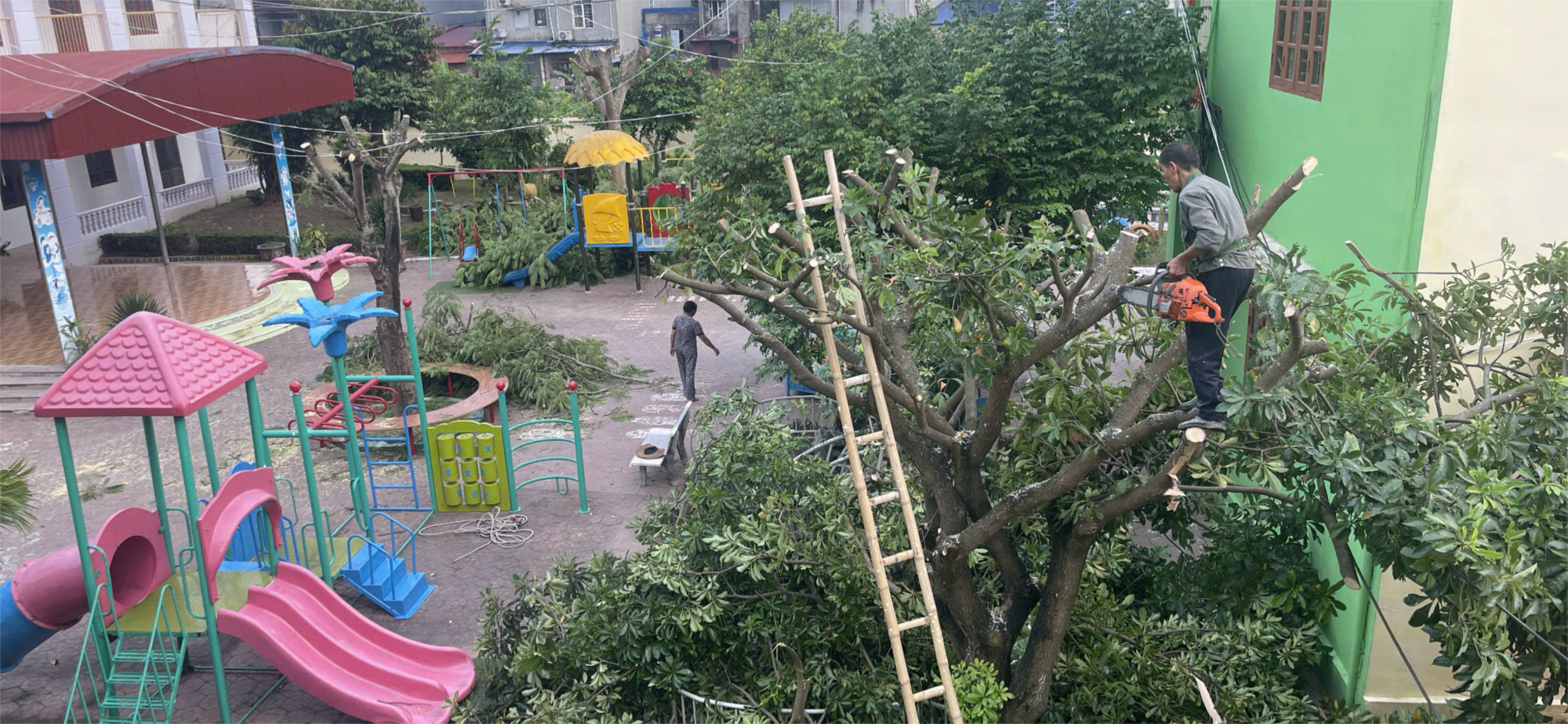 Đặc biệt, những cành cây to có nguy cơ gãy, rơi trong bão đã được xử lý kịp thời, tránh gây thiệt hại đến đồ dùng, sân chơi cũng như ảnh hưởng đến công tác chăm sóc, giáo dục trẻ. Đồng thời, việc tạo tán, cắt tỉa còn góp phần giữ gìn cảnh quan sư phạm xanh – sạch – đẹp, bảo đảm môi trường học tập, vui chơi an toàn cho trẻ.