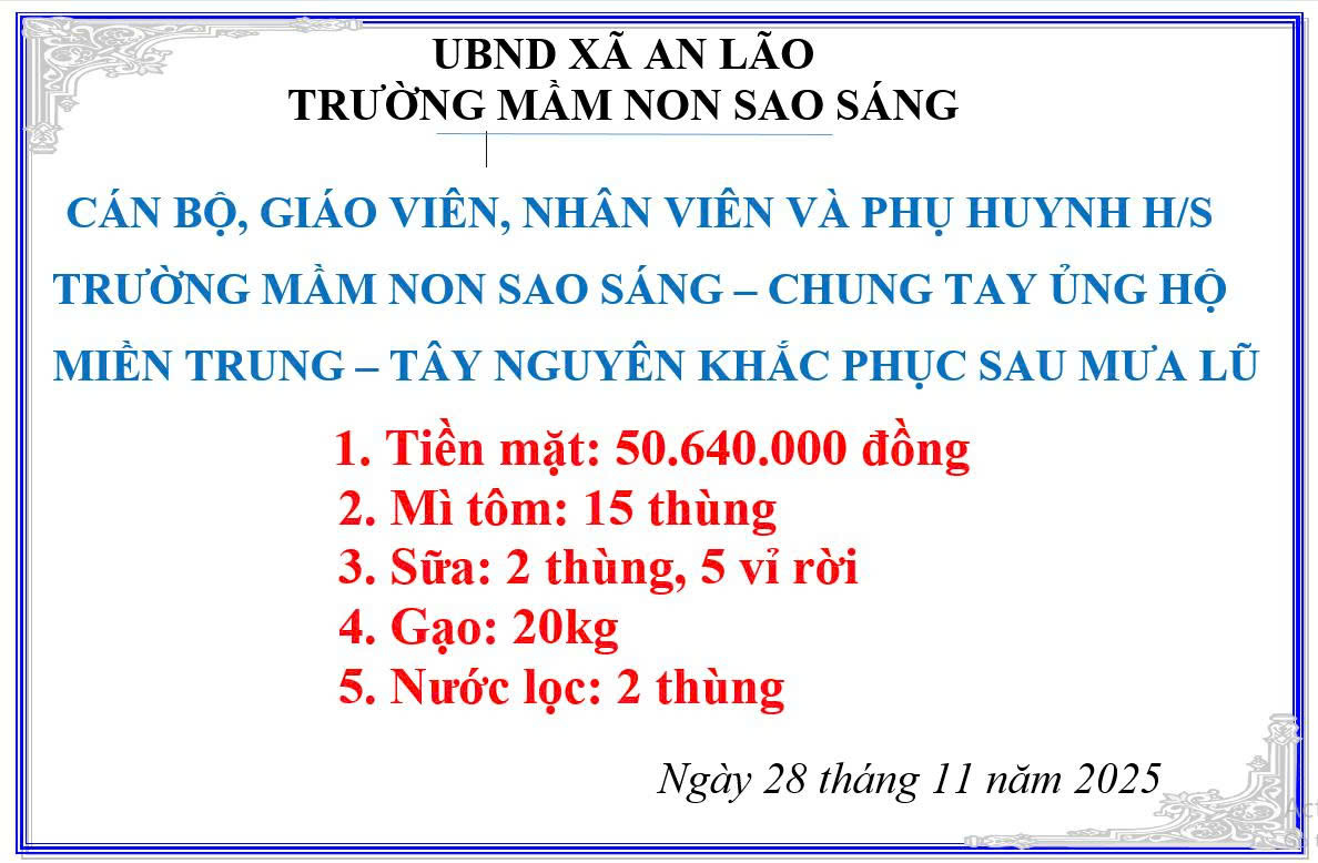 Hưởng ứng thư kêu gọi của Ủy ban MTTQ Việt Nam xã An Lão ngày 24/11/2025 về việc ủng hộ đồng bào miền Trung - Tây Nguyên khắc phục hậu quả sau mưa lũ. Sáng ngày 28/11/2025 trường mầm non Sao Sáng gửi thư kêu gọi tới cán bộ, giáo viên, nhân viên và phụ huynh học sinh ủng hộ bằng tiền mặt, nhu yếu phẩm. Trong 1/2 ngày kêu gọi, với tình thương, chia sẻ, tương thân tương ái, nhà trường đã tiếp nhận được tiền mặt và nhu yếu phẩm như sau: