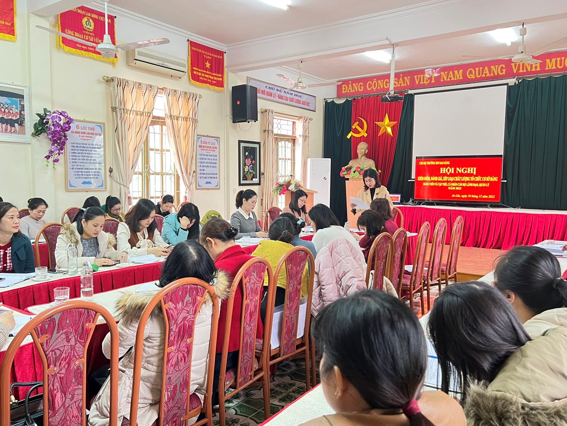Tại cuộc họp Đ/c Lê Thị Minh Hồng – bí thư chi bộ đọc báo cáo tổng kết công tác Đảng, kiểm điểm ban chi ủy, chi bộ năm 2022. Trong bản báo cáo đồng chí đã nêu rõ những thuận lợi, khó khăn và những thành tích đã đạt được của chi bộ nhà trường trong năm vừa qua và đề ra phương hướng khắc phục những tồn tại.