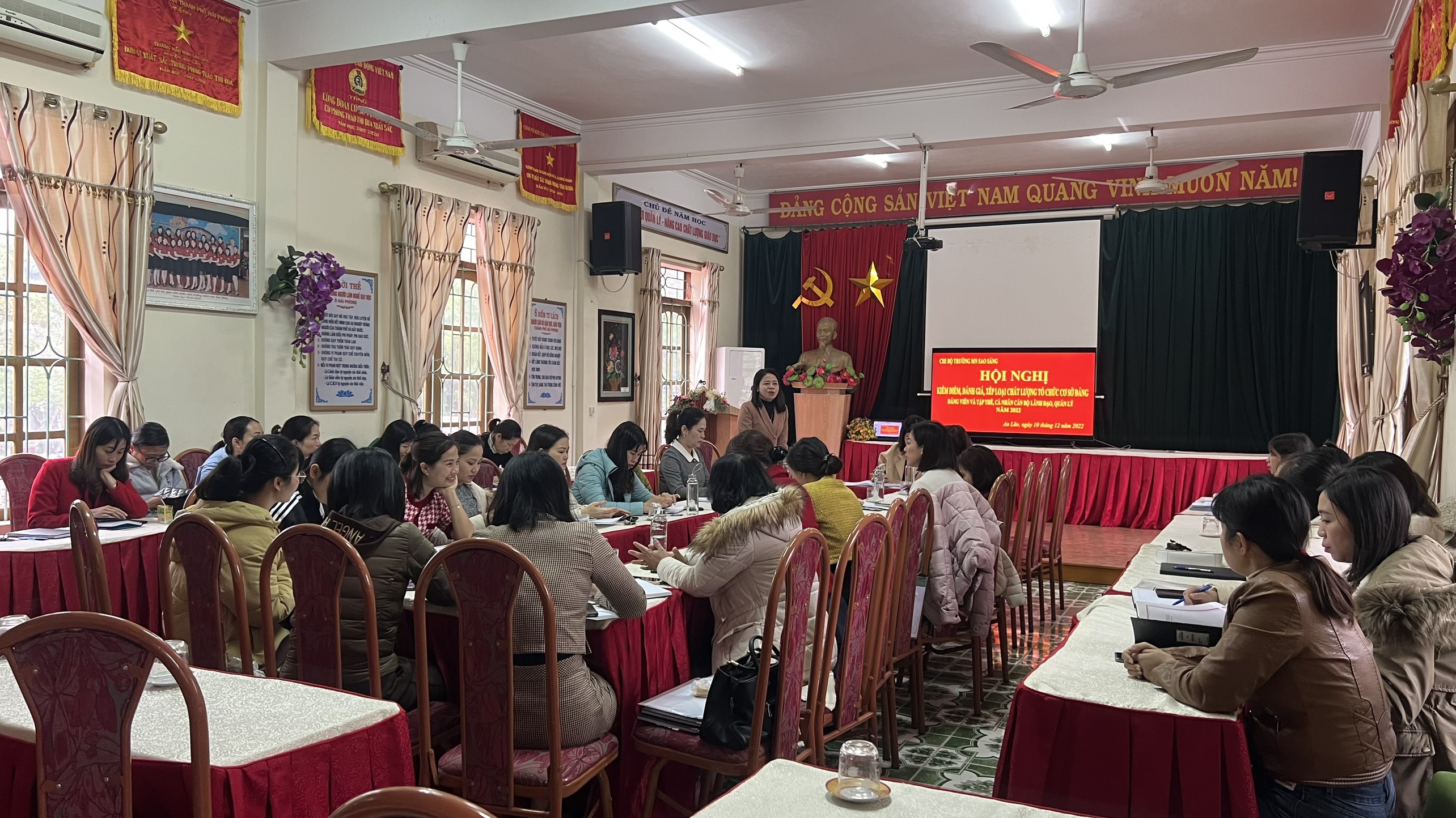 Thực hiện Kế hoạch số 10-KH/ĐU ngày 22/11/2021 của Đảng bộ thị trấn An Lão về việc kiểm điểm, đánh giá, xếp loại chất lượng đối với tổ chức cơ sở đảng, đảng viên và tập thể, cá nhân cán bộ lãnh đạo, quản lý năm 2021. Vào hồi 7h30 sáng ngày 10 tháng 12 năm 2022, Trường Mầm non Sao Sáng long trọng tổ chức hội nghị kiểm điểm, đánh giá xếp loại chất lượng chi bộ và xếp loại đảng viên năm 2022. Đánh giá, xếp loại chất lượng tổ chức đảng và đảng viên cuối năm là giải pháp quan trọng nhằm góp phần nâng cao năng lực lãnh đạo, sức chiến đấu của tổ chức đảng và chất lượng đội ngũ đảng viên. Thông qua công tác đánh giá nhằm giúp cấp ủy, tổ chức đảng và từng cá nhân tự soi, tự sửa; từ đó đề ra những giải pháp phát huy ưu điểm, khắc phục khuyết điểm trong lãnh đạo, quản lý và thực hiện nhiệm vụ; làm căn cứ để thực hiện các nội dung công tác cán bộ, đảng viên.