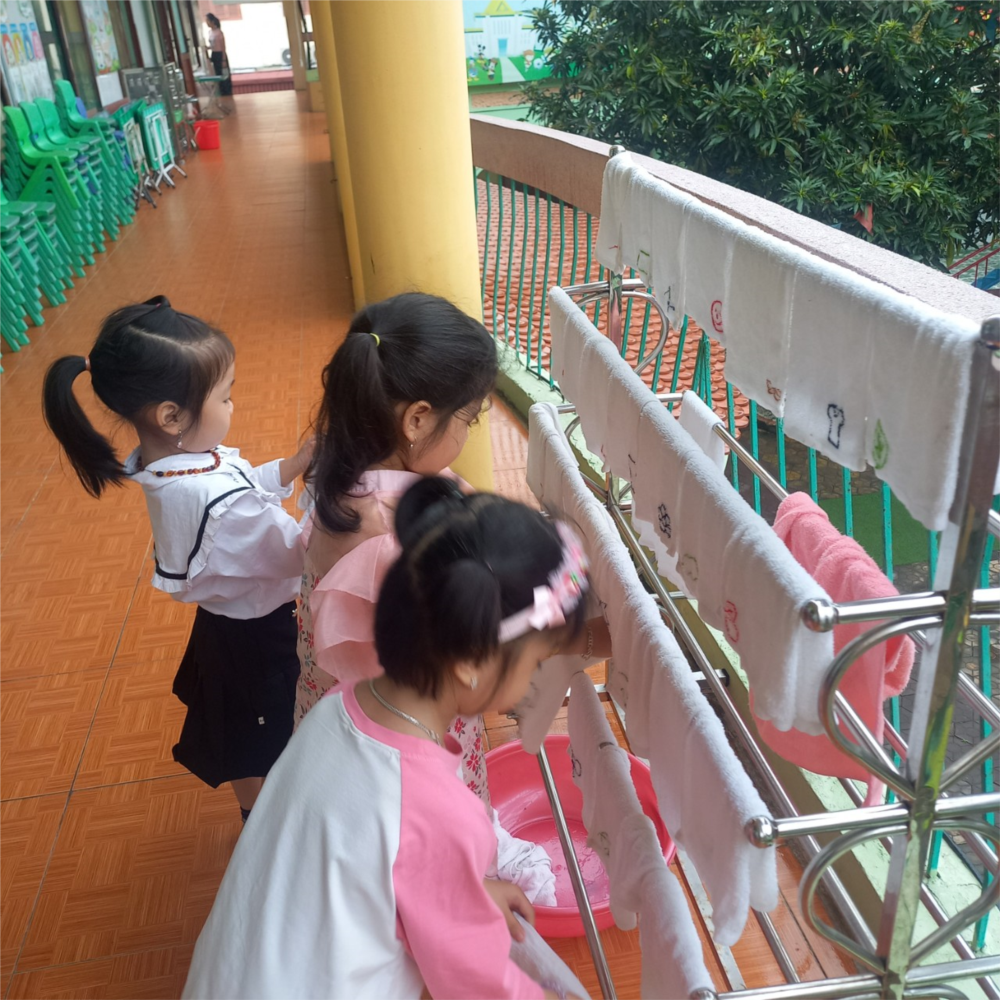 Các bạn lớp 4 tuổi B2 phơi khăn mặt