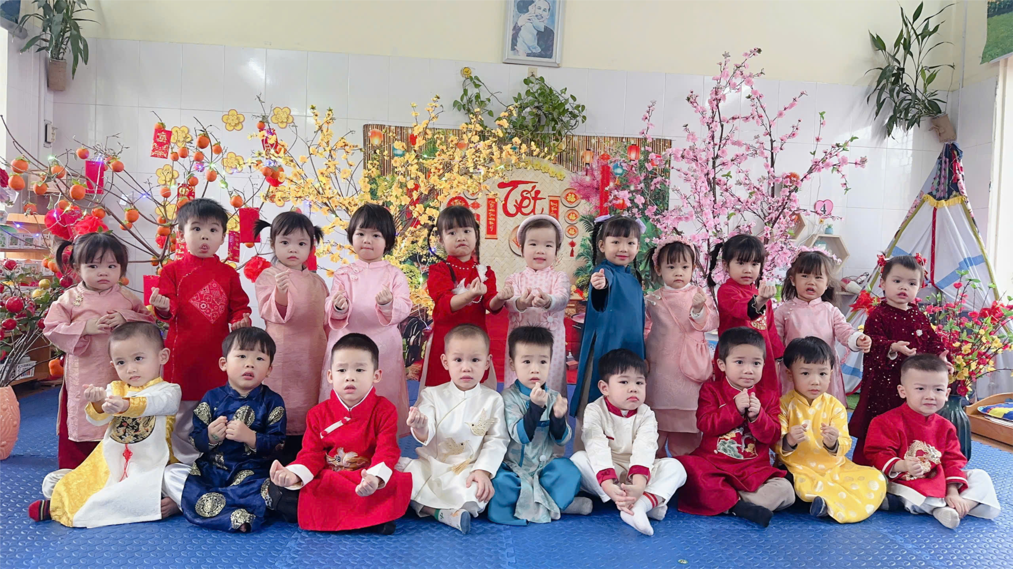 Không khí Tết rộn ràng đã ngập tràn trong lớp học của các bé 3 tuổi. Trước buổi chụp ảnh, các con được cô chuẩn bị cho những bộ trang phục thật xinh xắn, gọn gàng. Bé trai lịch sự trong áo dài nhỏ, bé gái dịu dàng với váy áo sắc xuân, ai cũng đáng yêu và rạng rỡ.