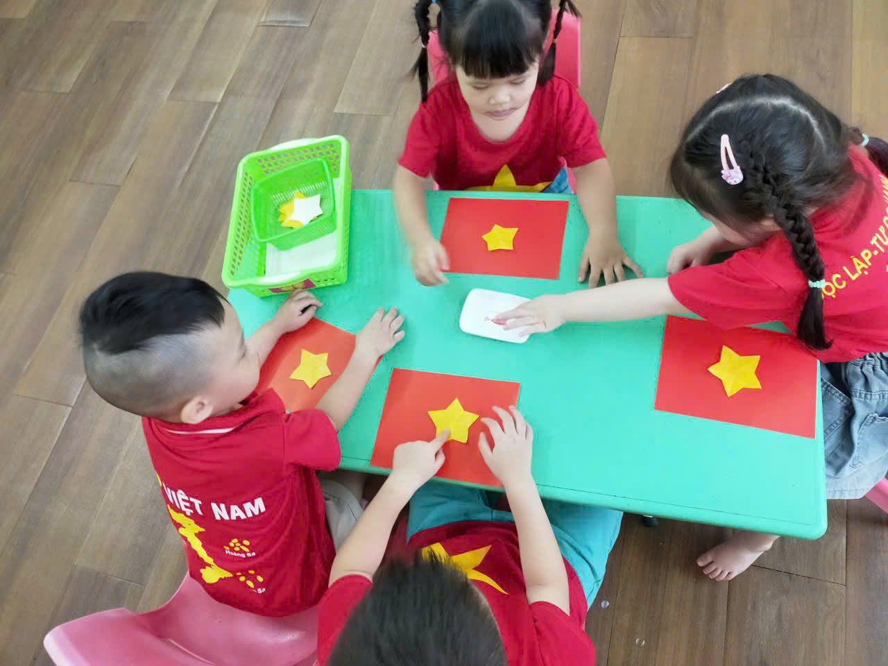 Dù đôi bàn tay còn bé nhỏ , đôi lúc vụng về, nhưng với sự háo hức và niềm vui hiện rõ trên gương mặt , các con đã cẩn thận dán từng ngôi sao vàng lên nền giấy đỏ để tạo nên lá cờ của Tổ quốc 🇻🇳. Mỗi lá cờ là một niềm tự hào, là tình yêu quê hương đất nước được nuôi dưỡng từ những ngày thơ ấu