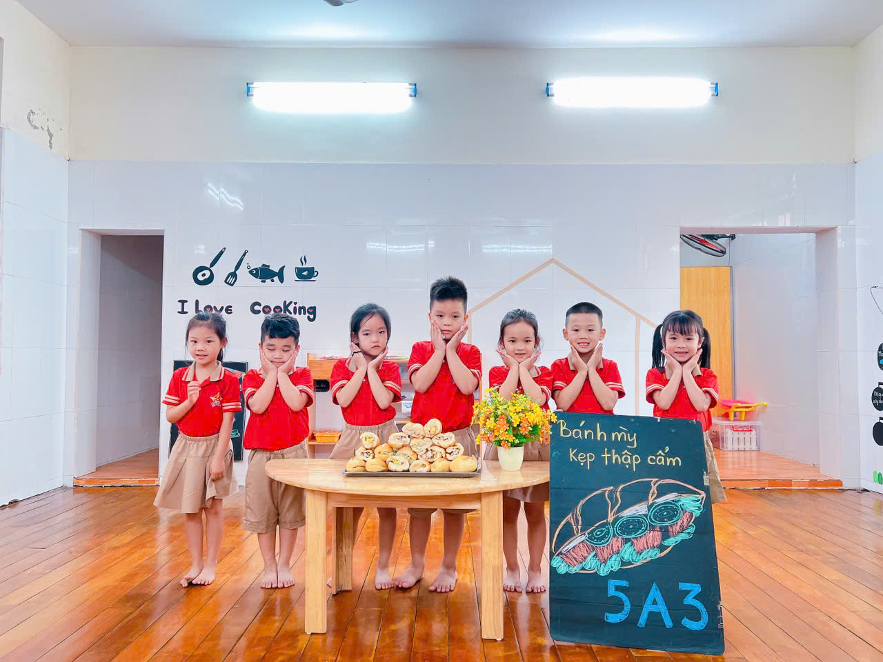 Hôm nay, ba mẹ và các thầy cô giáo cùng với các bạn nhỏ lớp 5A3 làm món bánh mỳ kẹp thập cẩm nha.