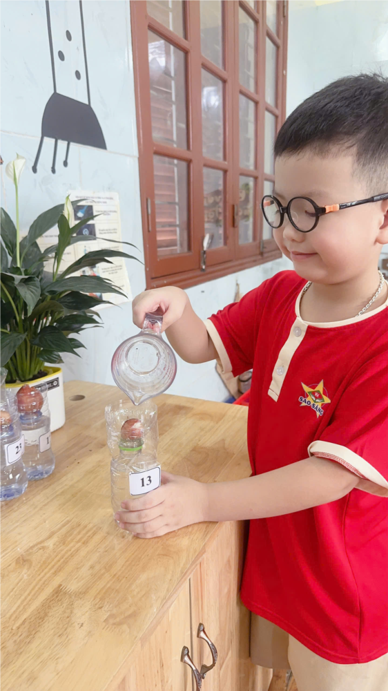 Mỗi bạn nhỏ đều được mang đến lớp một chai nhựa tái chế từ gia đình. Dưới sự hướng dẫn của cô giáo, các con cùng nhau cắt, gắn số ký hiệu cá nhân, đổ nước, và đặt những củ hành nhỏ xinh vào chai. Từ đó, mỗi bé có một “chậu cây riêng” của mình để chăm sóc và theo dõi mỗi ngày.