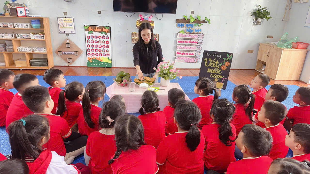 Dưới sự hướng dẫn của cô giáo, trước khi tiến hành hoạt động học các bé đã rửa đôi tay nhỏ xinh bằng xà phòng. Sau bài tập khởi động các bé được quan sát, kể tên các nguyên liệu để vắt, pha nước cam. Lợi ích của uống nước cam với cơ thể như biết nước cam chứa nhiều Vitamin C giúp cơ thể khỏe mạnh, tăng sức đề kháng. Sau khi được cô hướng dẫn và 1 bạn lên thực hành mẫu các bé đã vắt nước cam bằng dụng cụ an toàn dành riêng cho trẻ nhỏ.