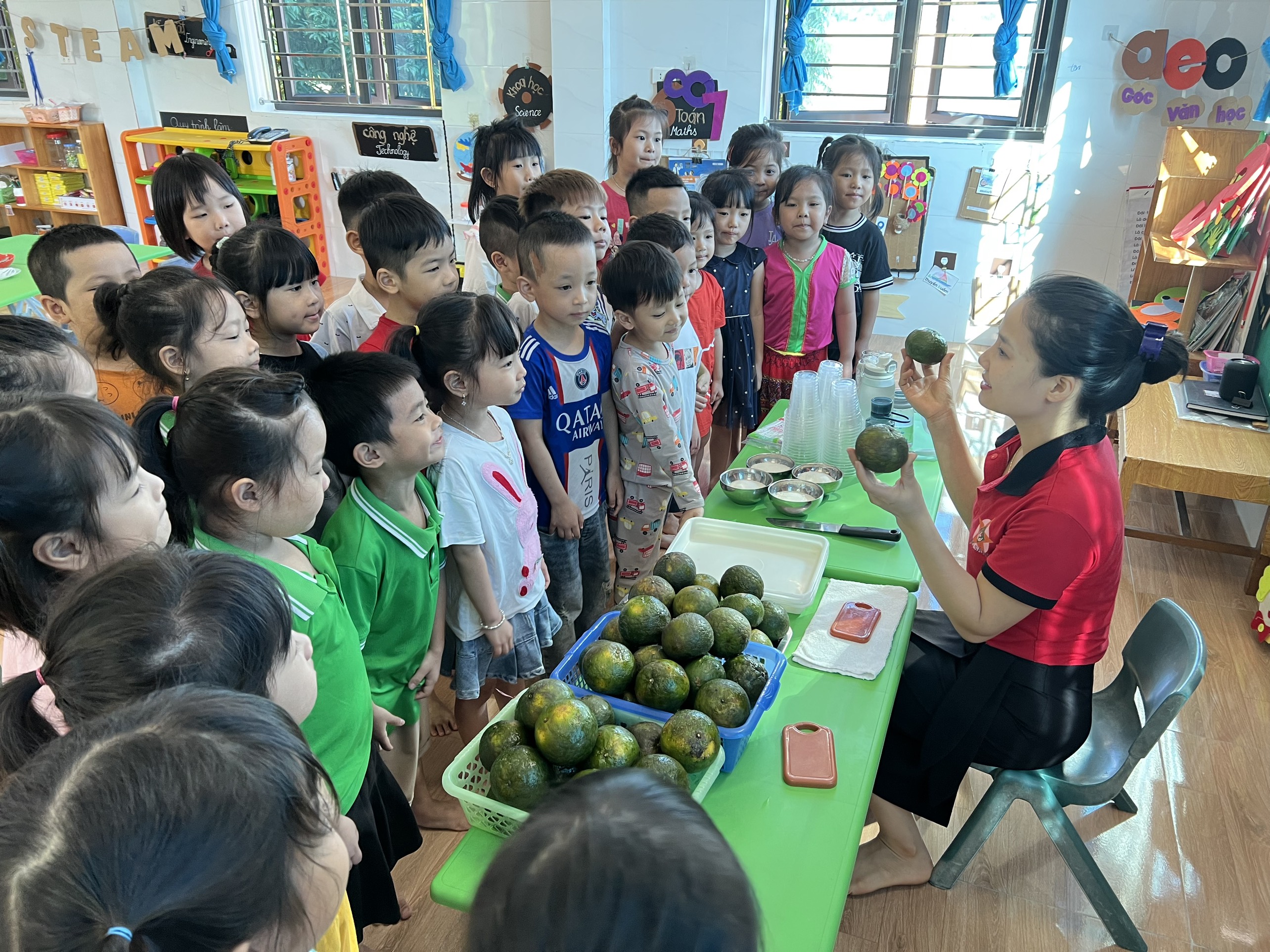 Các bé lớp 5T A5 trải nghiệm hoạt động "vắt nước cam" khiến các bé rất thích thú vì các bé được thưởng thức cốc nước cam ngon, ngọt do chính mình tự tay pha. Các bé còn hiểu được muốn cơ thể khoẻ mạnh và lớn lên cần phải ăn uống đủ chất và cần uống bổ sung các loại nước hoa quả chứa nhiều vitamin. Đặc biệt nước cam có tác dụng giải khát và bồi bổ thể lực vì có nhiều vitamin C. Các bé được cô giáo hướng dẫn cụ thể từng kỹ năng cầm, xoay để vắt cam sao cho ra hết nước trong miếng cam và cùng thưởng thức cốc nước cam thơm ngon bổ dưỡng.