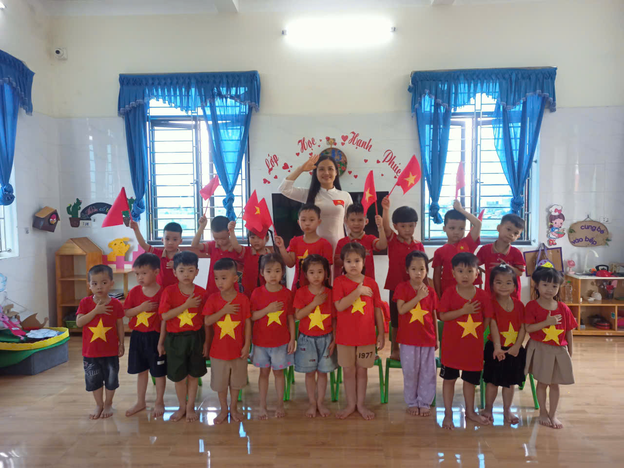 Trong không gian ngập tràn sắc đỏ của cờ hoa, các bạn nhỏ 5A5 đã cùng nhau biểu diễn những tiết mục hát múa đầy tự tin, ca ngợi quê hương đất nước. Những giọng ca trong trẻo, động tác múa hồn nhiên và nụ cười rạng rỡ của các con đã tạo nên một bầu không khí ấm áp, chan chứa niềm tự hào. Hoạt động giúp các bé thêm gắn bó với tập thể, rèn luyện sự mạnh dạn trước đám đông, đồng thời nuôi dưỡng tình yêu đối với Tổ quốc thân yêu.
