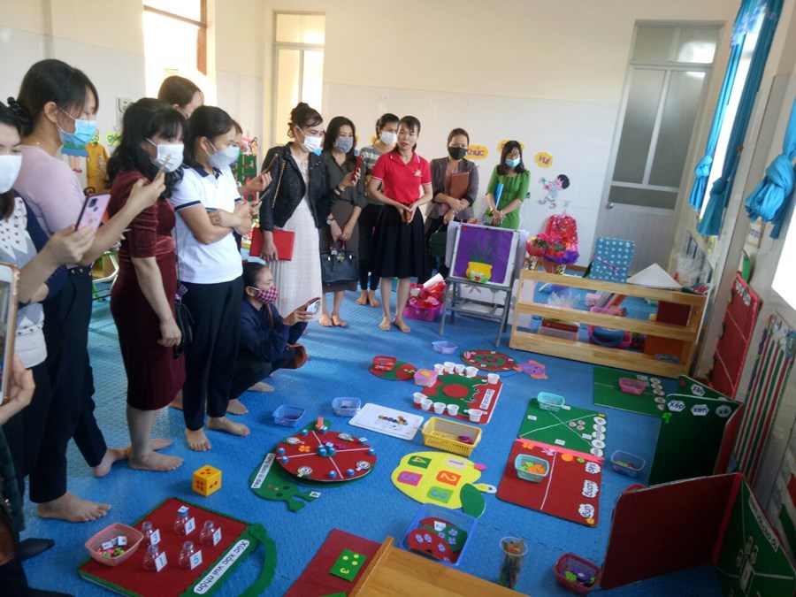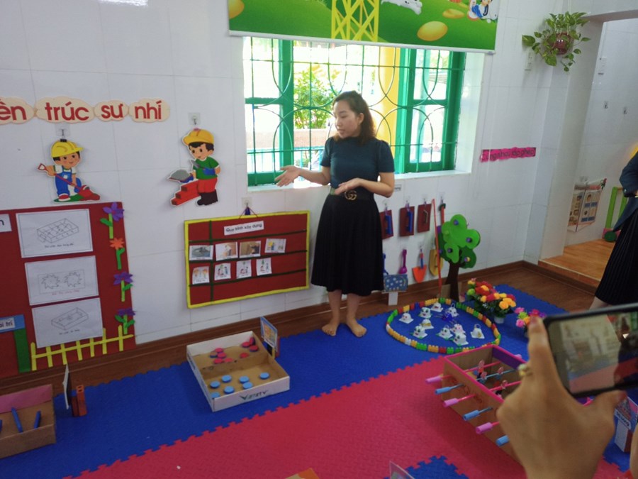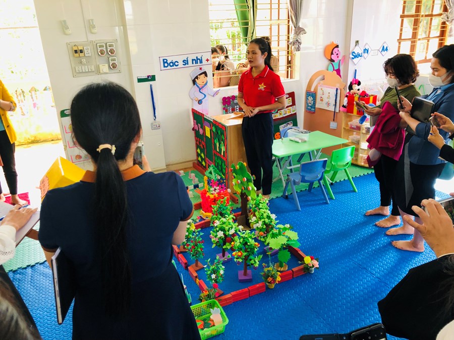 Các lớp được phân công tạo môi trường đã thiết kế và sắp xếp góc chơi với các nội dung, trò chơi phong phú, giáo viên chủ nhiệm sẽ thuyết trình các ý tưởng từng nội dung choi trong các góc: